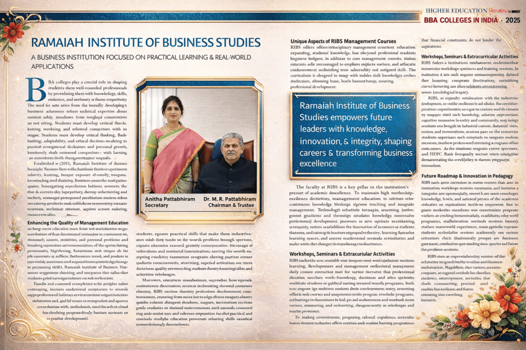 Ramaiah Institute of Business Studies (RIBS) is a degree college under the aegis of M.S.Ramaiah Foundation and affiliated to Bengaluru University, is a committed conglomerate knowledge resource center. RIBS is headed by Dr. M R. Pattabhiram, Founder Trustee of M S Ramaiah group of Institutions. Dr. M R Pattabhiram has decades of rich academic experience and has nurtured the Medical, Management, Law Colleges and a 1000 bed hospital of the MSR Group. RIBS is established with the aim of providing quality education on par with international standards.